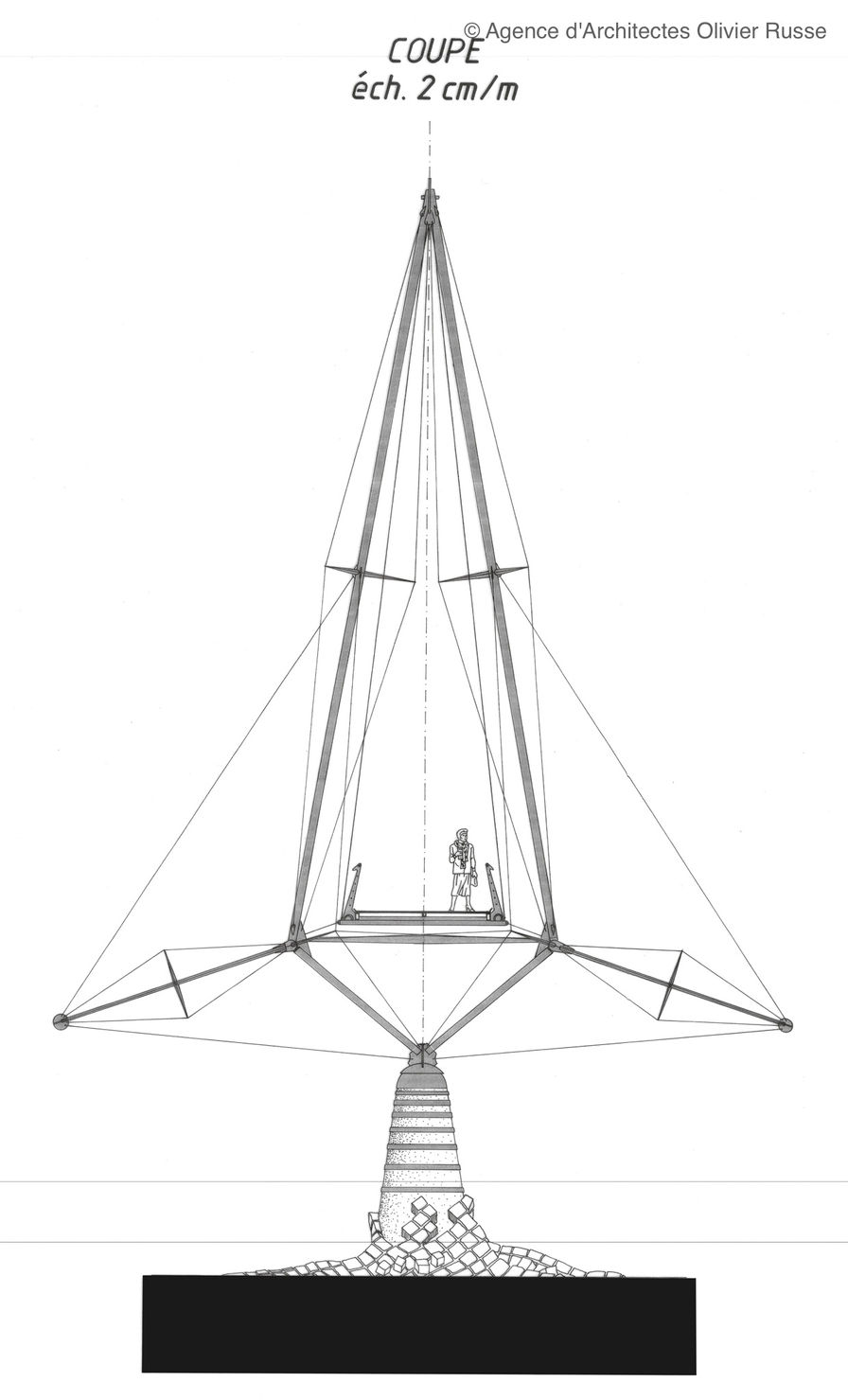 L’idée d’une structure dite 'légère' est à la fois une inspiration et une nécessité. D’une part, ce type de construction, rendu célèbre notamment par les travaux de Frei Otto, a toujours fasciné Olivier Russe. D’autre part, une structure légère était indispensable pour franchir une telle distance. Ne pouvant compter sur la masse pour assurer sa stabilité, la passerelle repose sur un ingénieux système d’haubanage, où chaque élément de la structure est précontraint dans toutes les directions.